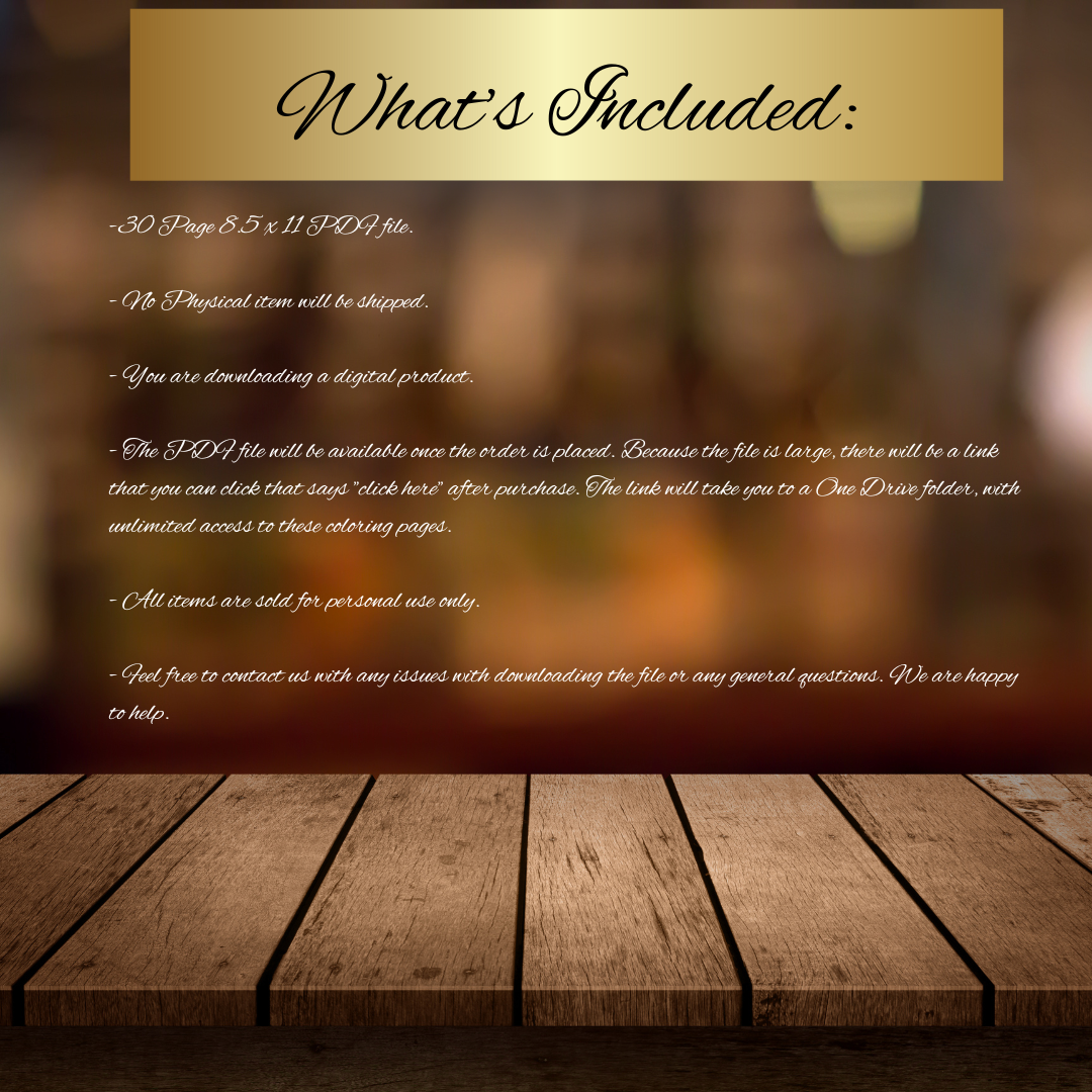 - The PDF file will be available once the order is placed. Because the file is large, there will be a link that you can click that says "click here" after purchase. The link will take you to a OneDrive folder with unlimited access to these coloring pages.
